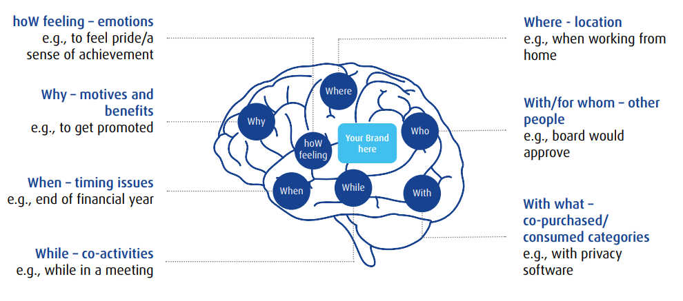The more your comms hammer that relationship between those key entry points and your brand (through your advertising, website, collateral, thought leadership pieces, etc.), the higher the chances your brand will come to mind when people think of those situations.