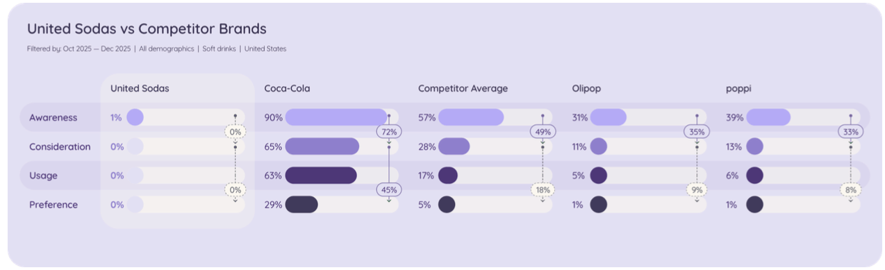 That’s where the data lands with unusual clarity. United Sodas sits at roughly 1% awareness. In the same tracking set, Poppi sits around 39% and Olipop around 31%. Those numbers don’t merely describe a gap; they describe different stages of existence. Poppi and Olipop are brands with established mental presence. United Sodas is a brand that is still largely absent from memory.
