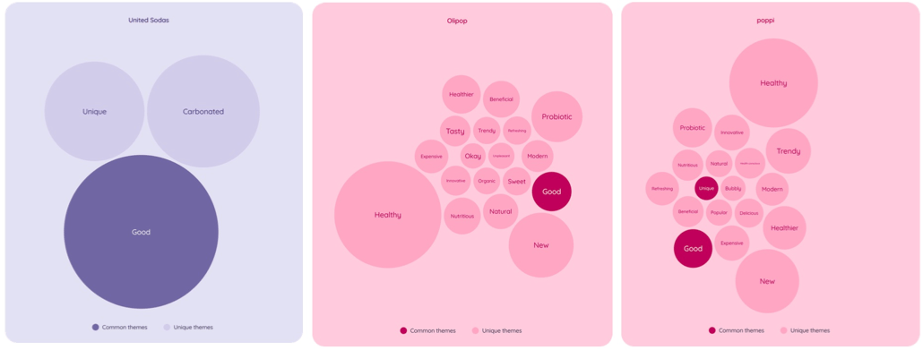 United Sodas also picks up lighter associations like “carbonated” and “unique,” but the center of gravity remains generic. And in a category where the leading challengers have crowded their perception maps with highly legible meaning — distinct health and functional associations that collapse into memorable cues — generic goodness is not a competitive position. It is an absence of one.